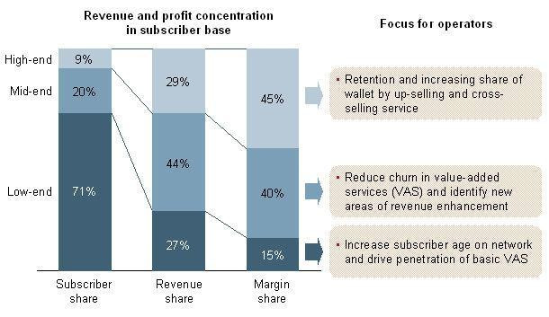 Operators in fast-growing emerging markets are under constant pressure to balance market share expansion with profitability. While there is an expectation that they will expand their subscriber share continuously, their high-ARPU and high-profitability user base is under sustained attack from new entrants as well as existing competitors. This threat is especially severe because of the concentration of the user base and profit pools: in emerging markets, such as India, the top 9% of subscribers are estimated to contribute about 29% of revenues and 45% of EBITDA margins, as shown in the chart above.